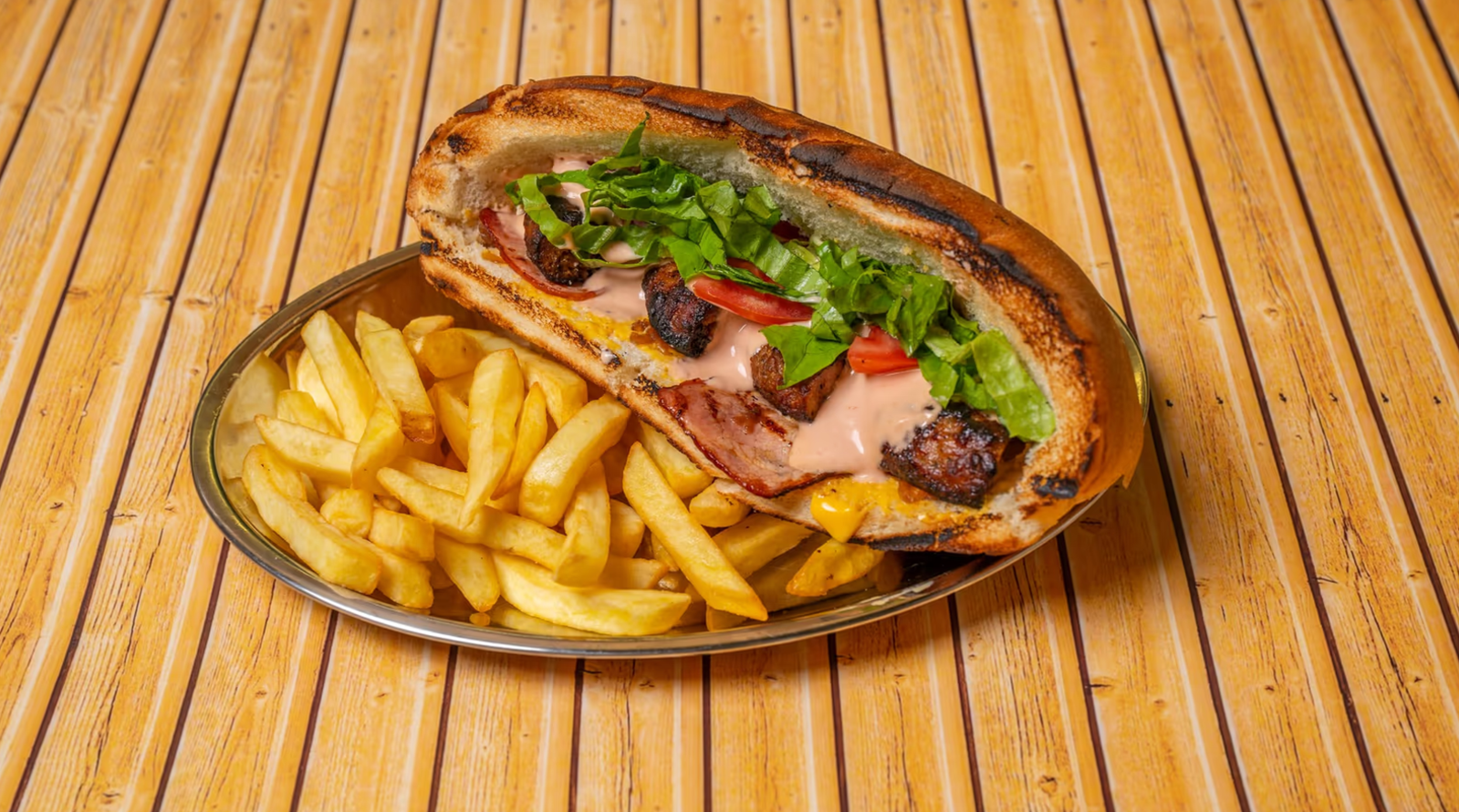 2 μπιφτέκια μοσχαρίσια, cheddar, μπέικον, καραμελωμένα κρεμμύδια, μαρούλι, ντομάτα,κίτρινη σως, πατάτες