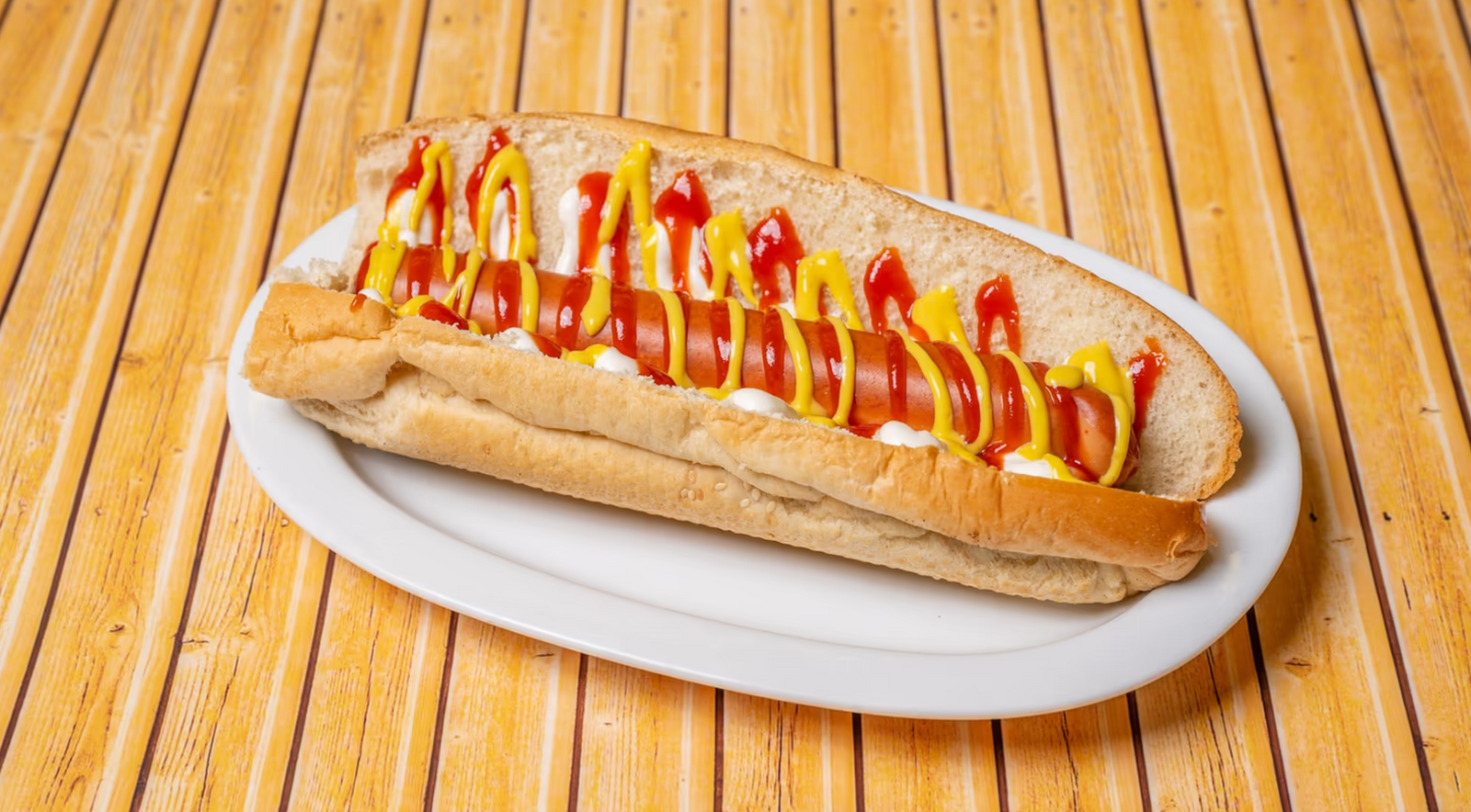 λουκάνικο φρανκφούρτης, μαγιονέζα, κέτσαπ, μουστάρδα